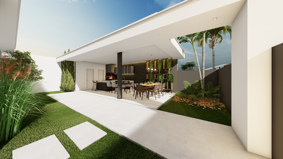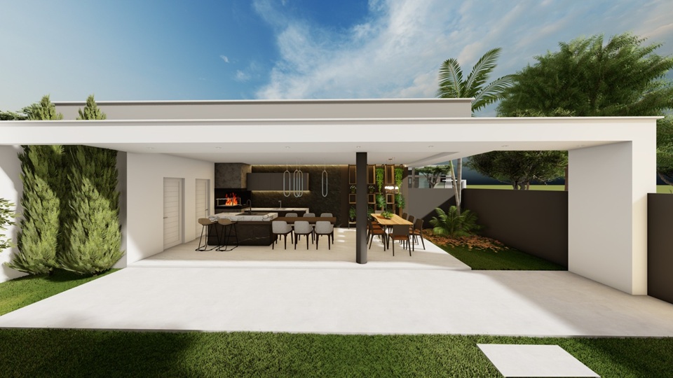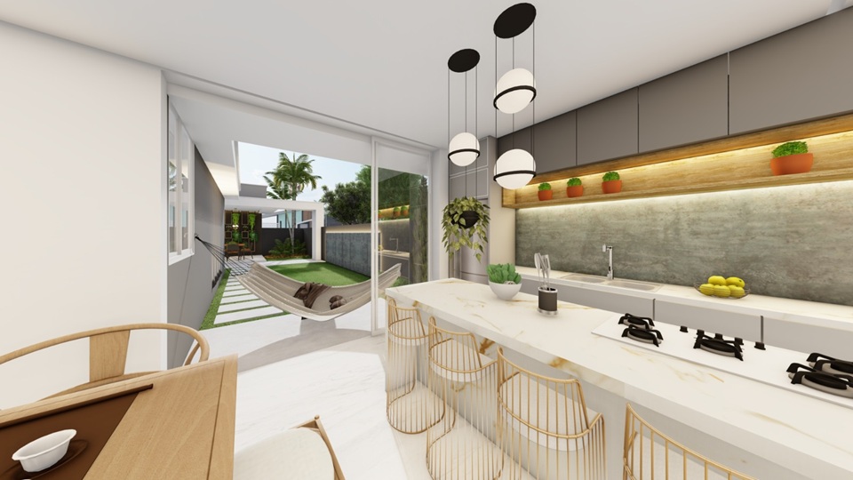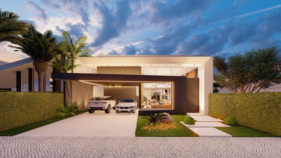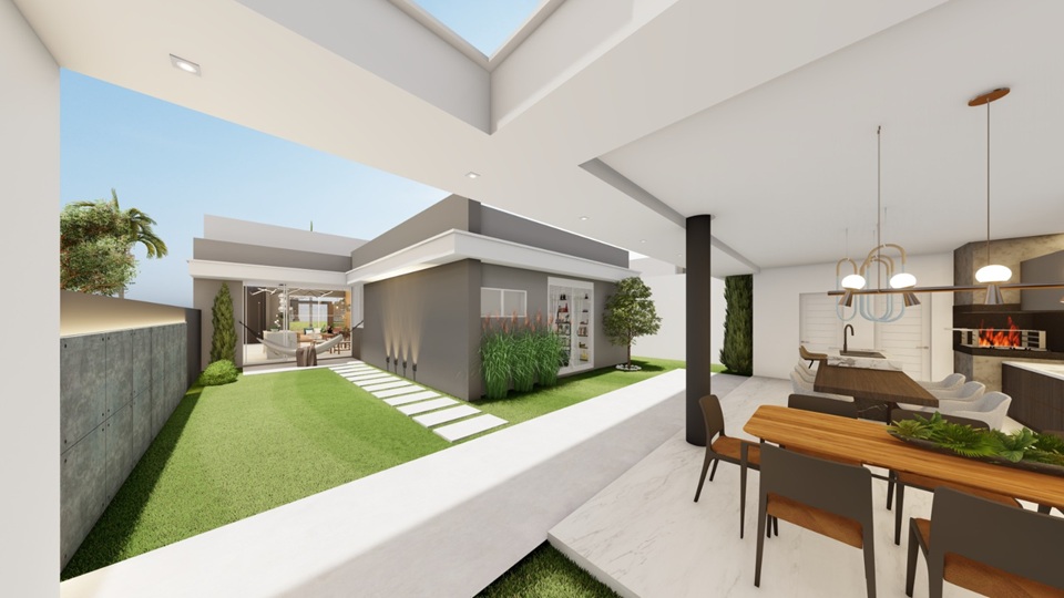 No pavimento principal, sala e cozinha integradas criam um ambiente fluido, iluminado e com pé direito alto, trazendo leveza e sensação de liberdade. As 3 suítes garantem conforto e privacidade para todos, tornando cada quarto um refúgio especial.