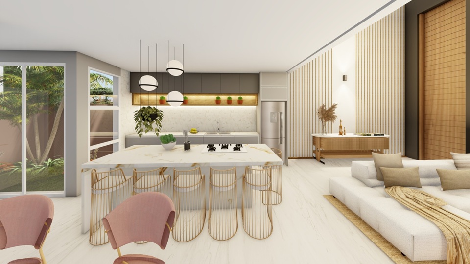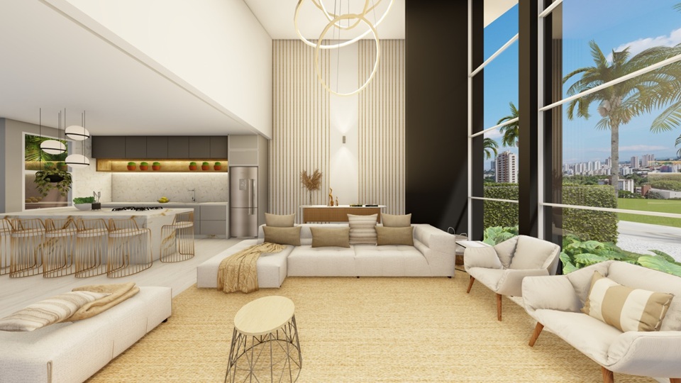 A integração entre sala e cozinha cria um ambiente amplo e iluminado, com pé direito alto que traz imponência e leveza ao mesmo tempo.