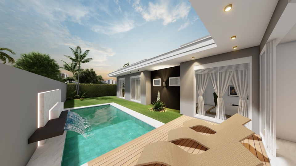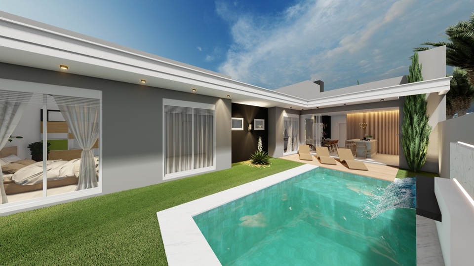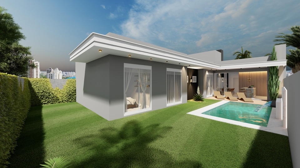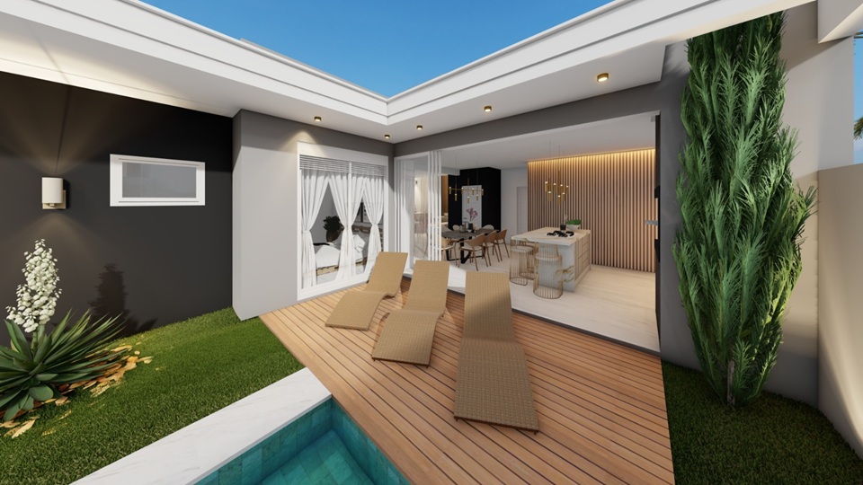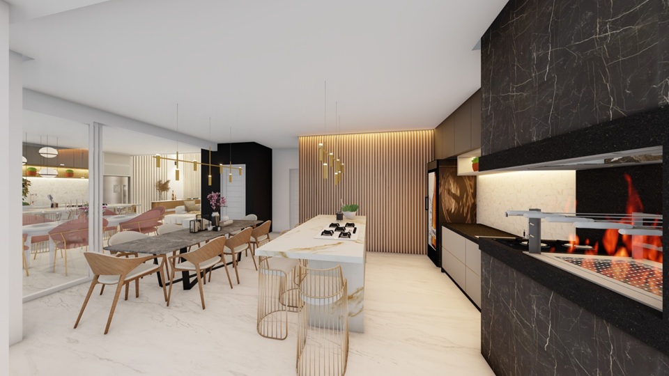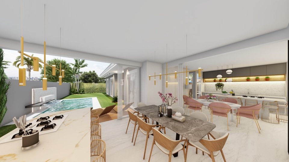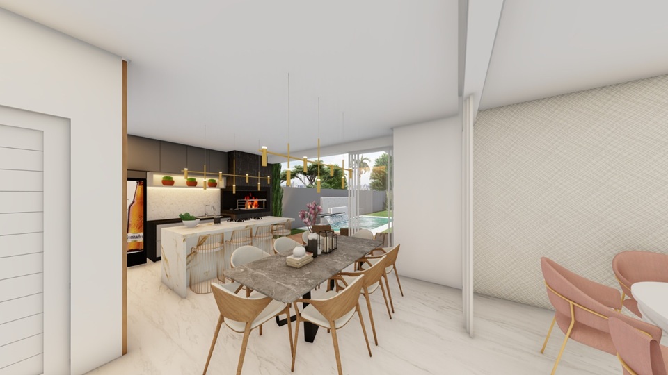 A área gourmet com churrasqueira se conecta ao pátio com uma piscina de 16,24m², criando o ambiente ideal para receber amigos, aproveitar os finais de semana e aproveitar momentos de descanso ao sol.